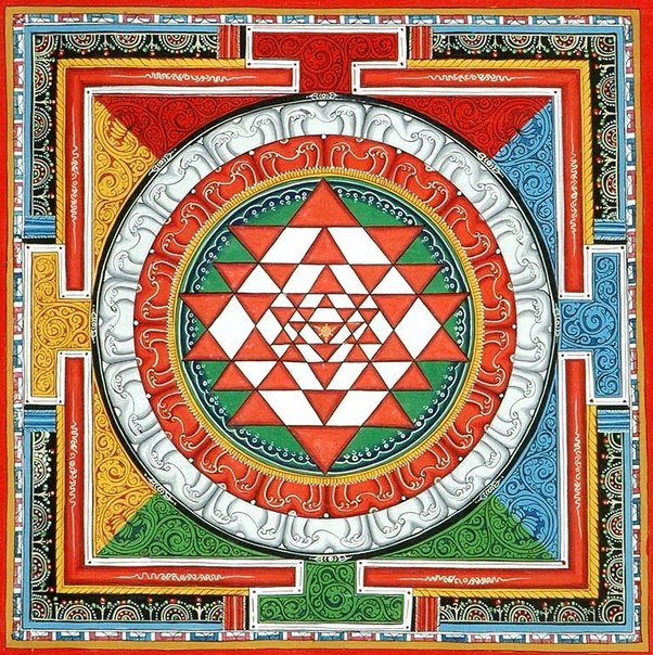 Шри Янтра — наиболее знаменитая из всех тантрических янтр. Представляя собой мистическое устройство космоса, Шри Янтра образована взаимным пересечением треугольников в двух направлениях: четыре вершинами вверх, символизируя мужской принцип, и пять вершинами вниз, символизируя женский принцип.